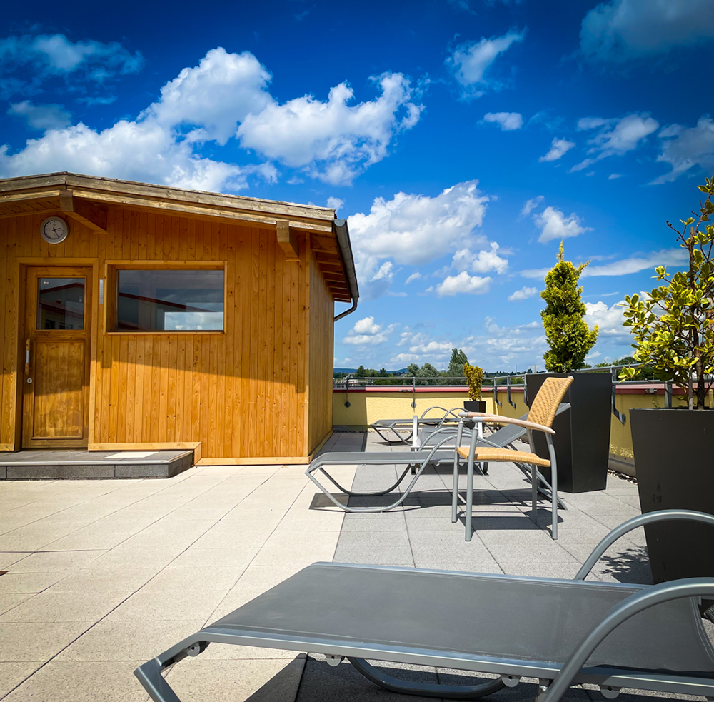 In dem großzügigen Saunabereich mit Sonnen-Dachterrasse kannst du nach deinem Training wunderbar entspannen: